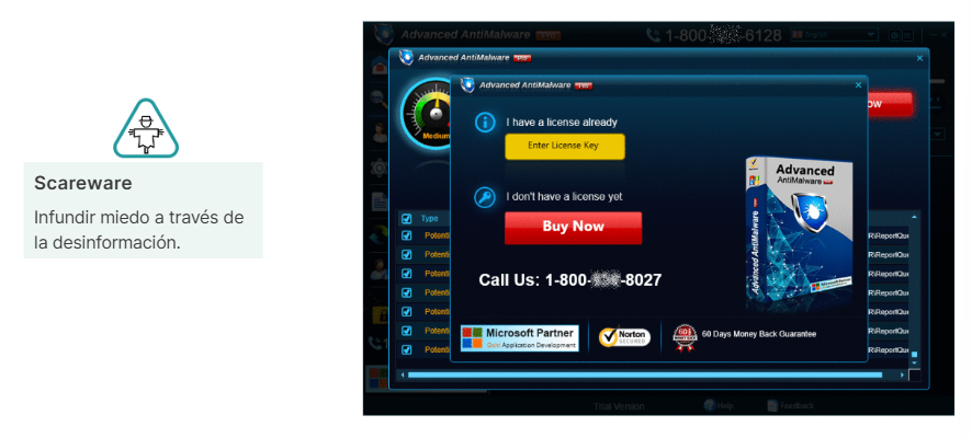 Scareware: mensajes falsos que generan miedo para inducir acción.