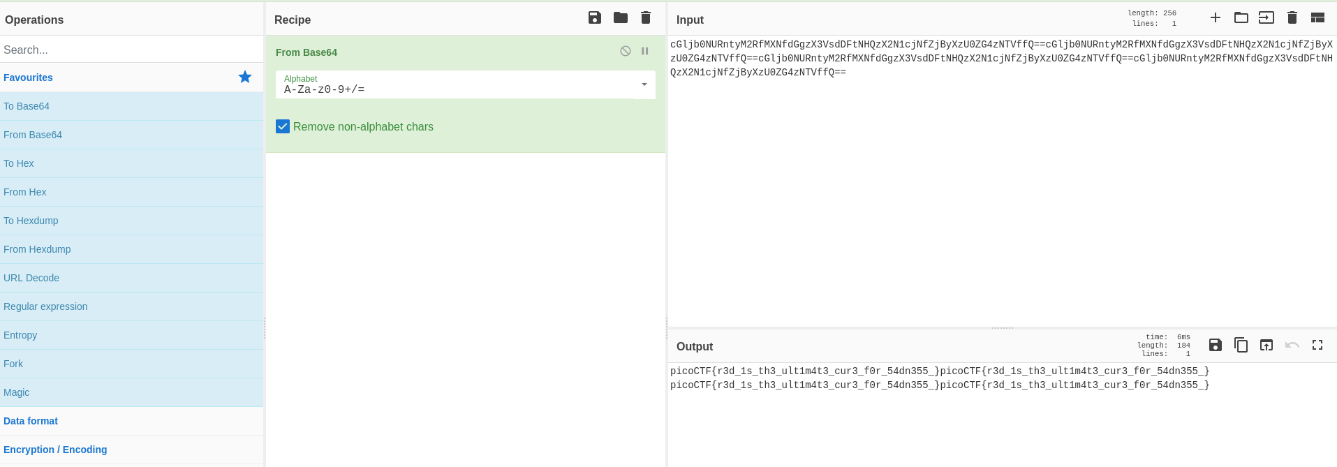 https://gchq.github.io/CyberChef/Copiamos el texto sospechoso y elegimos from base64 como en la siguiente imagen: